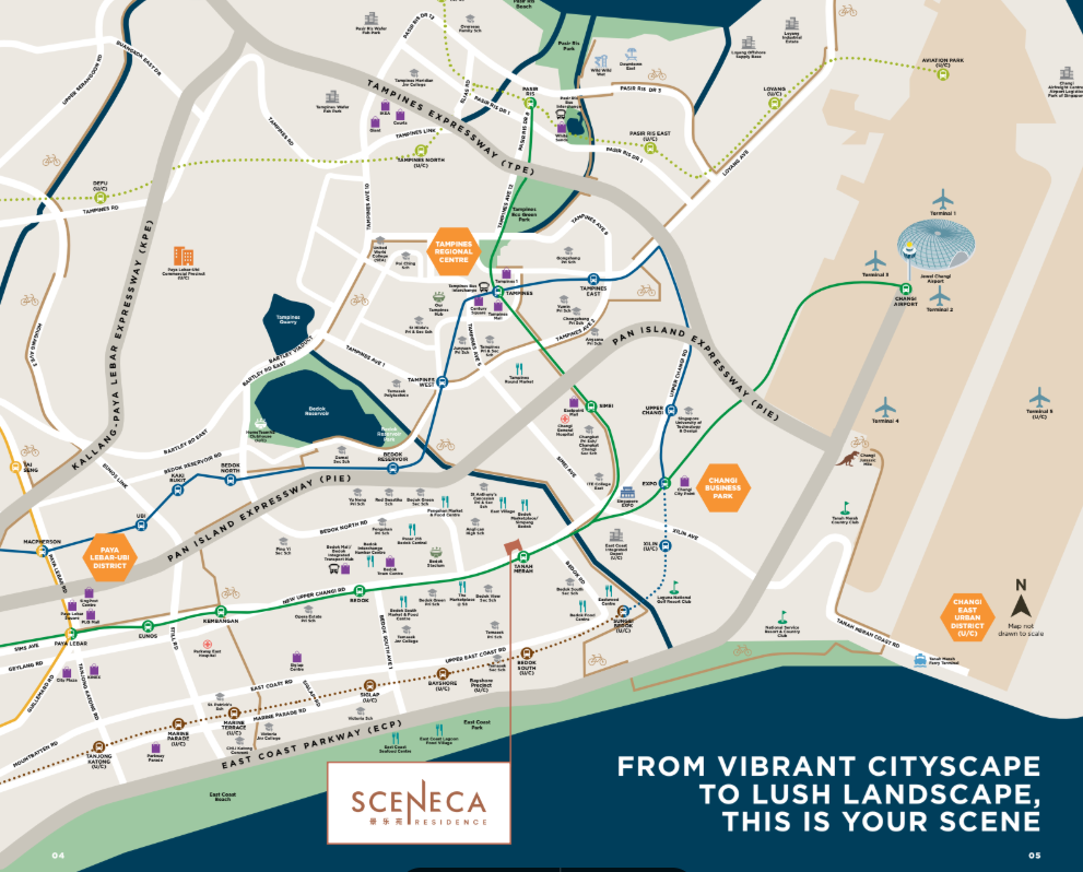 A defining characteristic of Sceneca Residence is its exceptional connectivity. The development is directly connected to the Tanah Merah MRT station on the East-West Line via a 24/7 sheltered linkway, facilitating urban commuting without the challenges of external weather conditions. Residents are one stop away from Bedok Mall and the integrated Bedok Bus Interchange, two stops from Changi International Airport and Jewel, and a short ride to Singapore Expo, Changi Business Park, Tampines Regional Centre, and the Central Business District, including Marina Bay. Additionally, the upcoming conversion of the Tanah Merah to Changi Airport Branch into part of the Thomson-East Coast Line by 2040 is set to further enhance northbound access to Singapore and strategic connectivity to key employment and recreational hubs.